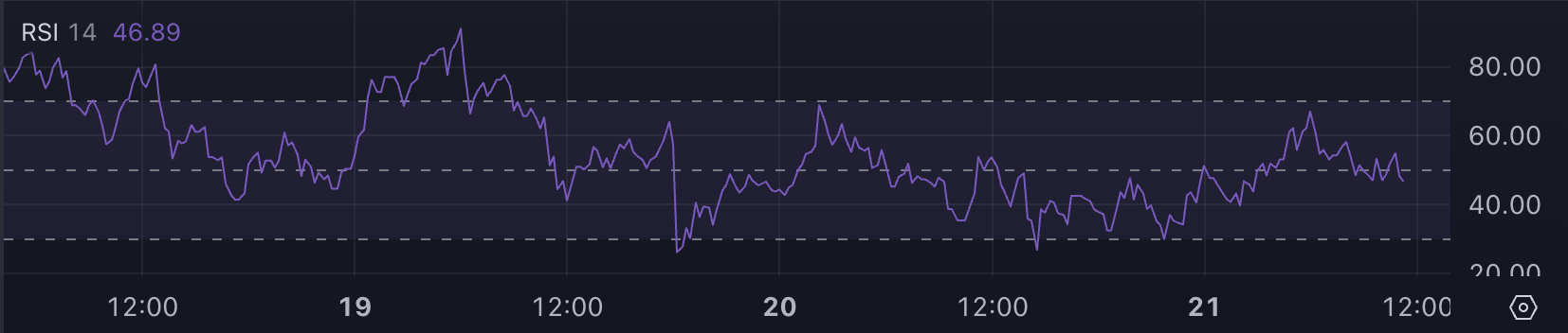 Relative Strength Index (RSI) on tekninen indikaattori, jota käytetään mittaamaan hintaliikkeiden nopeutta ja suuruutta markkinatunnelman arvioimiseksi. Se vaihtelee 0:sta 100:aan, ja arvot yli 70 viittaavat yliostettuihin olosuhteisiin, jotka usein edeltävät hinnan korjausta, ja arvot alle 30 viittaavat ylimyytyihin olosuhteisiin, mikä voi viitata mahdolliseen palautumiseen.
