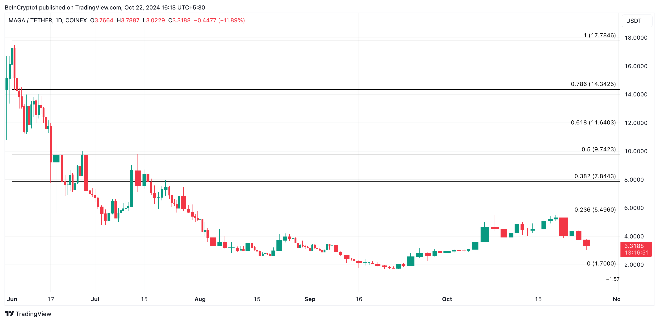 TRUMP:n hinta on laskenut 22 % viimeisen 24 tunnin aikana. Samana aikana sen kaupankäyntivolyymi on ollut 12 miljoonaa dollaria, nousten 122 %.