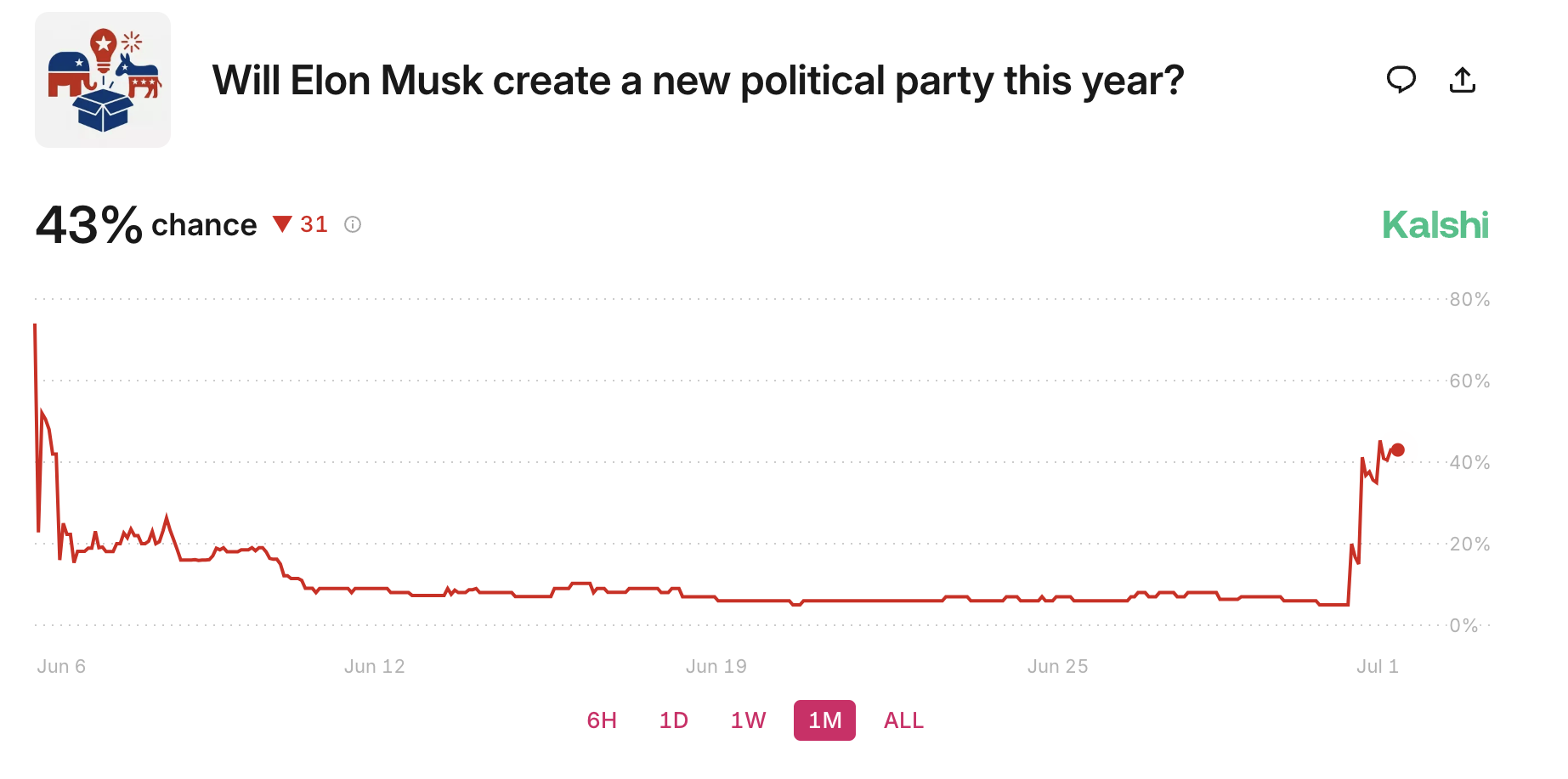 Ennustusmarkkinat, kuten Kalshi, olivat jo asettaneet kertoimia Muskin TAP:n perustamiselle, ja nämä nousivat tänään 41 prosenttiin. Teslan perustaja myös retweetasi Kalshin kertoimet, mikä osoittaa, kuinka vakavissaan hän on uuden poliittisen puolueen perustamisesta.