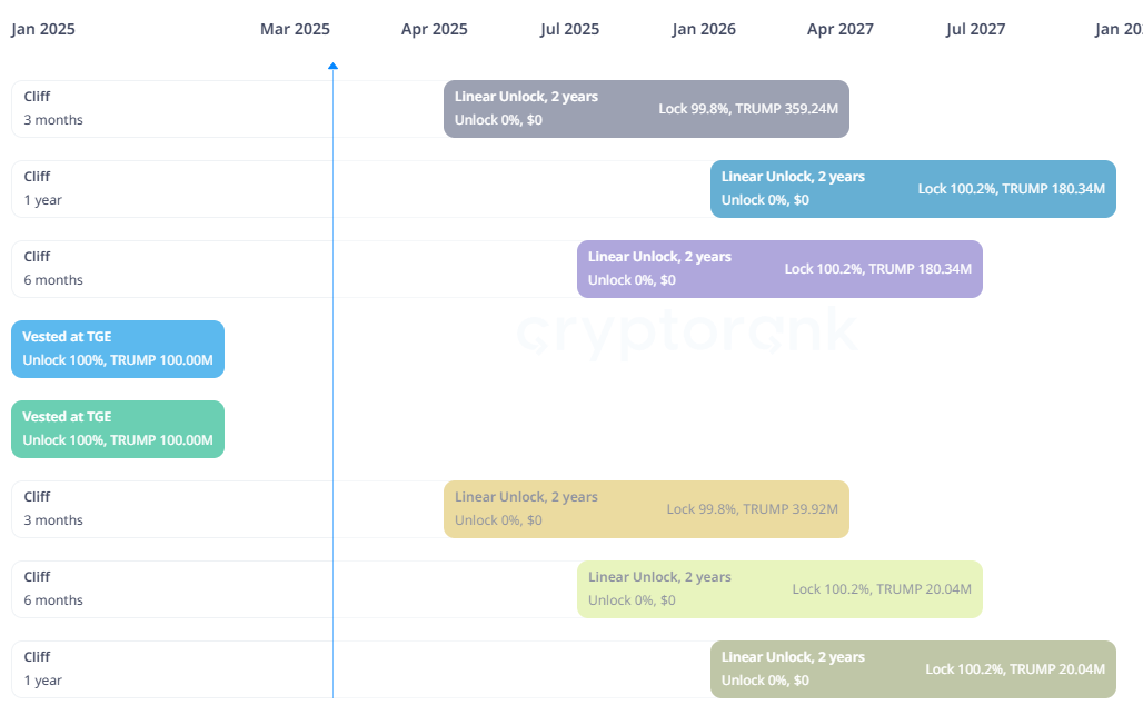 Cryptorankin tietojen mukaan 40 miljoonaa TRUMP-tokenia vapautetaan alkaen 18. huhtikuuta. Tämä vastaa 4% koko tarjonnasta ja on arvoltaan yli 472 miljoonaa dollaria. Tämän jälkeen vähintään puoli miljoonaa TRUMP-tokenia tulee kiertoon päivittäin, jatkuen vuoden 2027 loppuun asti. Tämä vapautusprosessi saattaa lisätä myyntipainetta ja laskea yksityissijoittajien odotuksia.