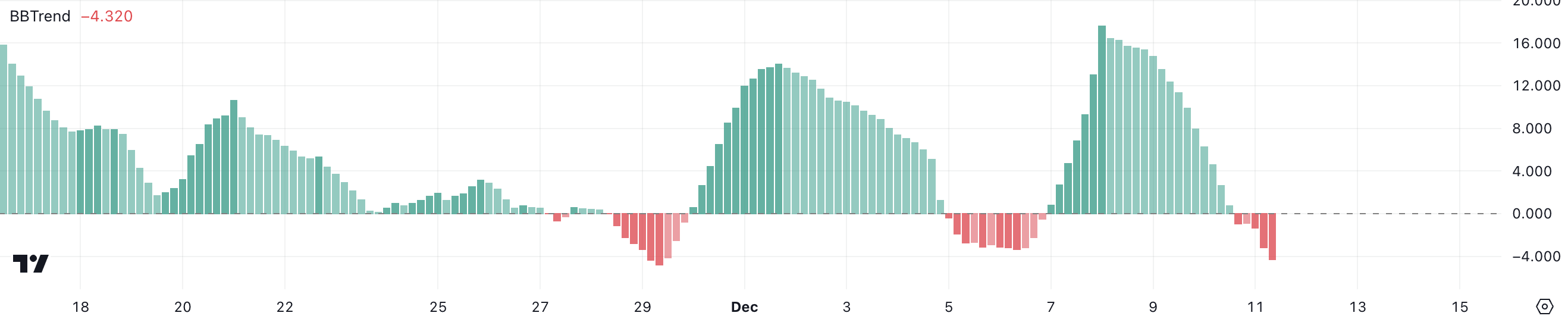 RENDERin BBTrend-indikaattori on tällä hetkellä -4,13, mikä on alhaisin taso sitten marraskuun 29. päivän. Se oli positiivinen joulukuun 7. ja 10. päivän välillä, jolloin se saavutti huippunsa 17,6 joulukuun 8. päivänä, mutta BBTrend on nyt kääntynyt negatiiviseksi.