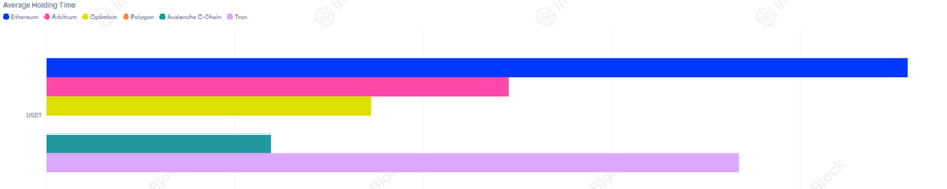 USDT:n keskimääräinen pitoaika kussakin ketjussa tukee edelleen tätä havaintoa. Tiedot osoittavat, että Ethereumin käyttäjät pitävät USDT:tä tyypillisesti 228 päivää, lähes kolme kertaa pidempään kuin Optimismin haltijat. TRON-osoitteet ylläpitävät myös USDT:tä pitkään, keskimäärin 183 päivää.
