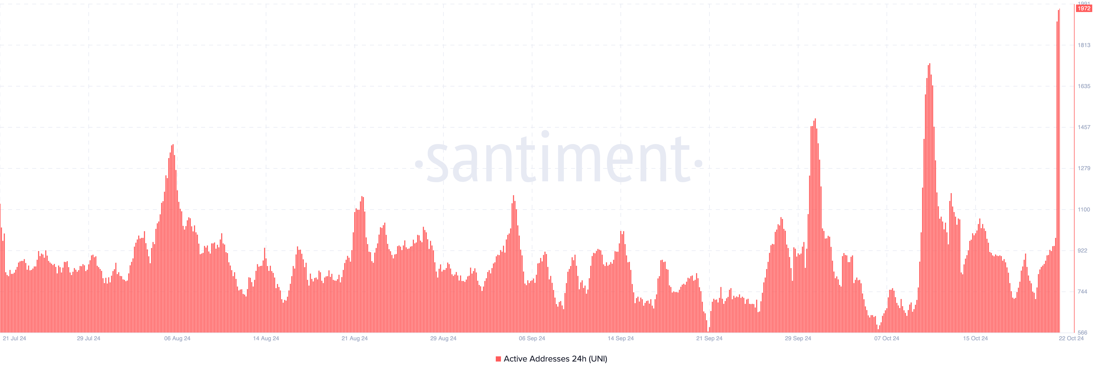 Päinvastoin, aktiivisten osoitteiden lasku osoittaa alhaista käyttäjävuorovaikutusta, mikä, jos se jatkuu, saattaa johtaa merkittävään hinnan laskuun. Nykyisen verkkoaktiivisuuden nousun perusteella on mahdollista, että UNI:n hinta voisi jatkaa nousuaan, jos tämä suuntaus pysyy.