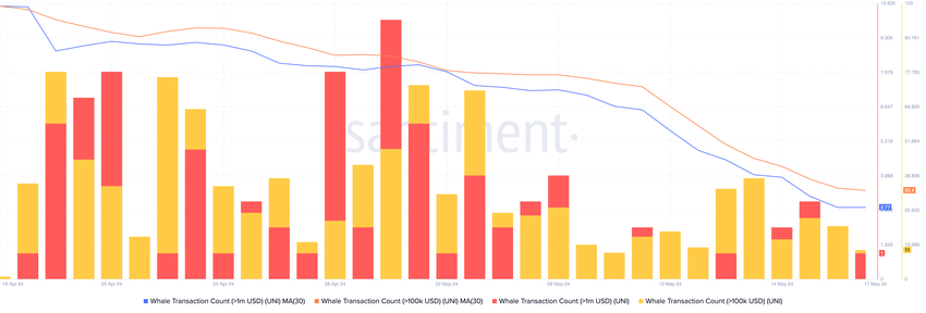 UNI:n päivittäiset valaskaupat ovat vähentyneet viimeisen kuukauden aikana. Yli 100 000 dollarin arvoisten päivittäisten tapahtumien määrä on laskenut 44%. Suuremmissa, yli 1 miljoonan dollarin arvoisissa tapahtumissa päivittäin suoritettujen tapahtumien määrä on myös pudonnut yli 50% viimeisen 30 päivän aikana.