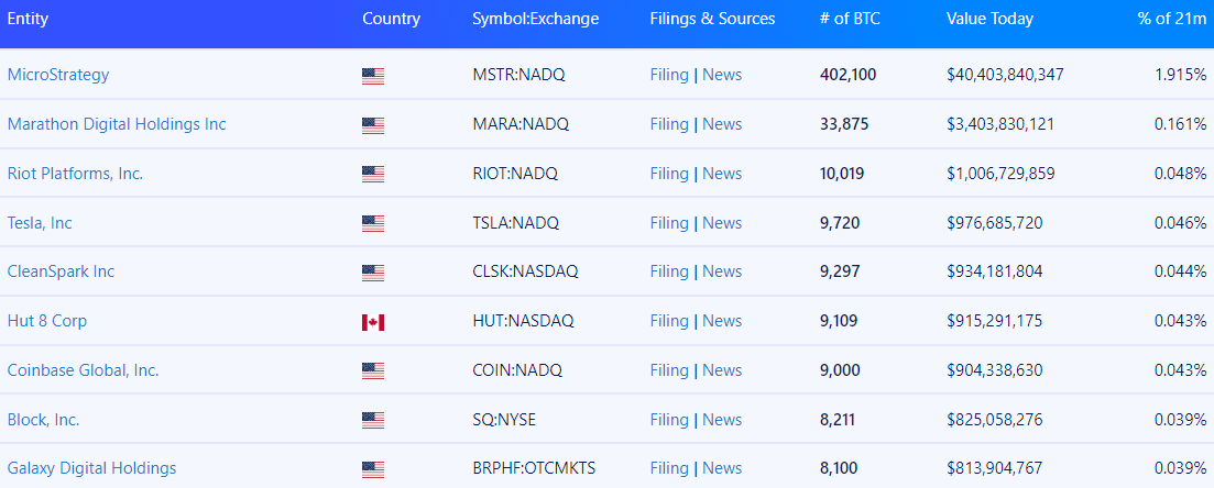 Vaikka Satoshi Nakamoto on edelleen suurin yksittäinen Bitcoinin omistaja, useilla tahoilla on merkittäviä osuuksia kryptovaluutassa. MicroStrategy johtaa yritysomistuksia 402 100 BTC:llä, joiden arvo on yli 40 miljardia dollaria.