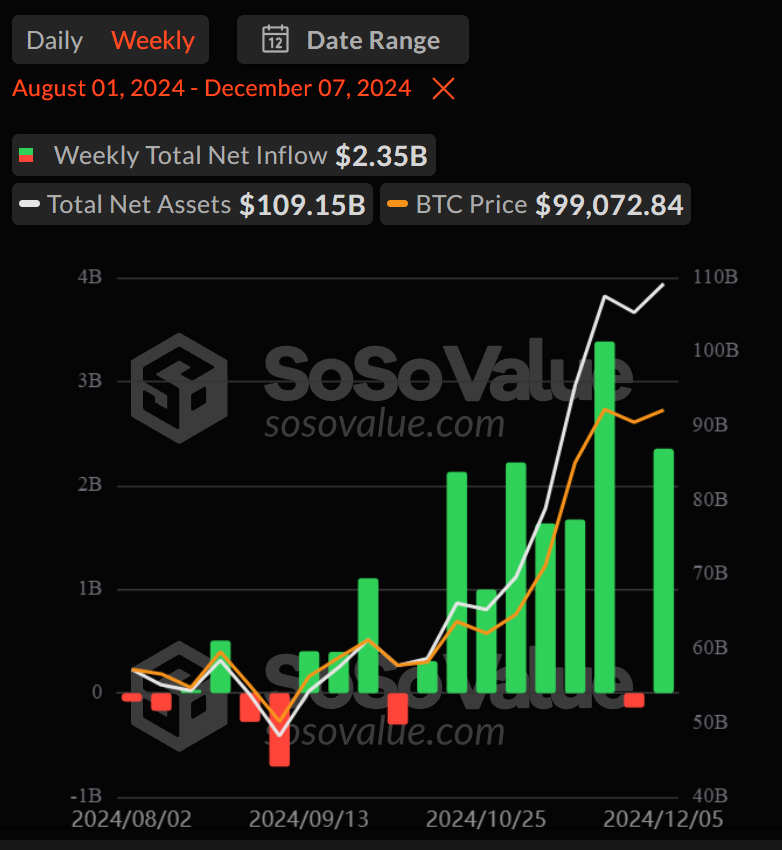 Pelkästään tällä viikolla rahastot näkivät lähes 2,35 miljardia dollaria nettosijoituksia. Bitcoinin 100 000 dollarin virstanpylväs on nostanut näiden ETF:ien hallinnoimat kokonaisvarat yli 109 miljardiin dollariin.
