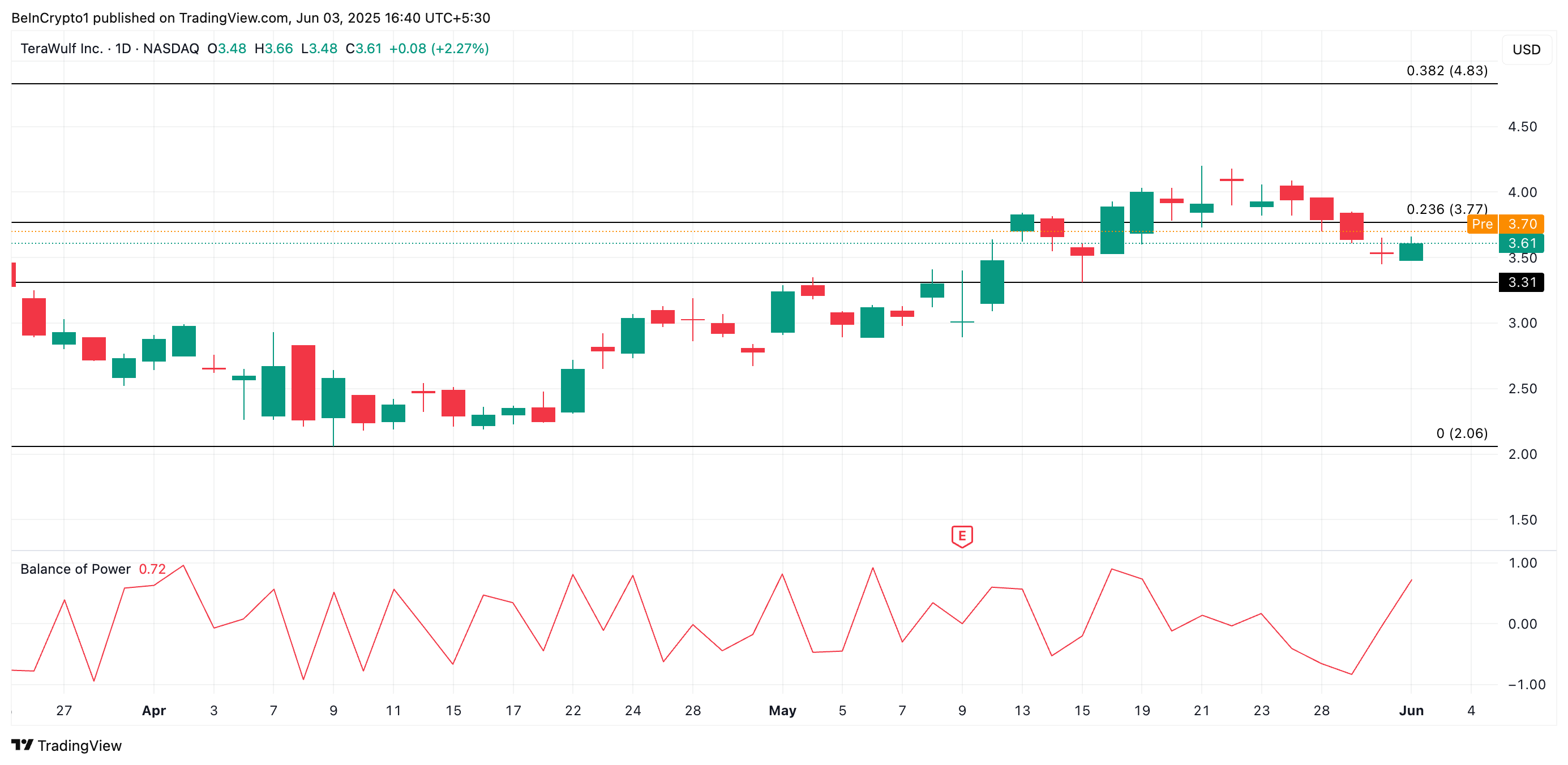 TeraWulf (WULF) päätti eilen punaisella, mutta on palautunut 5 % viimeisen päivän aikana ja vaihtaa omistajaa hintaan 3,61 dollaria ennen markkinoiden avautumista.