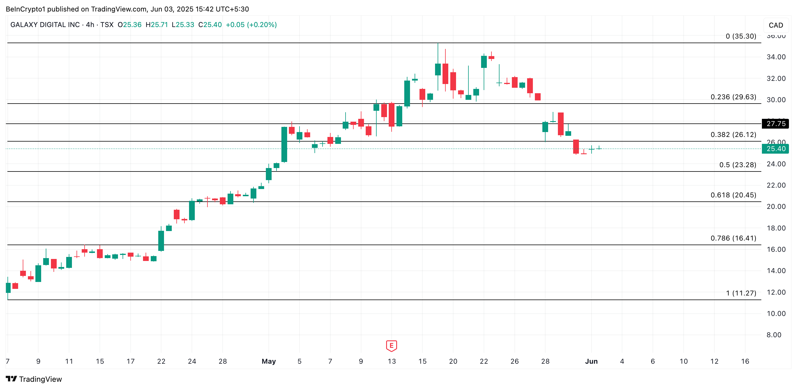Jos noususuuntaus jatkuu, GLXY voisi testata vastustason 26,12 dollaria. Onnistunut läpimurto tällä hintatasolla voisi nostaa osakkeen kohti 27,75 dollaria.