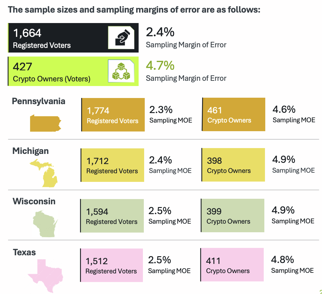 Tutkimus tunnisti useita mielenkiintoisia suuntauksia kansallisella tasolla. Puolet valtakunnallisista äänestäjistä pitää kryptoa tärkeänä kysymyksenä, mutta tämä luku hyppää 85 prosenttiin krypto-omistajien keskuudessa. Lisäksi 92 prosenttia krypto-omistajista vastasi, että he todennäköisesti äänestävät, mikä tekee heistä mahdollisesti tärkeän äänestäjäryhmän.