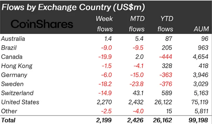 Kuten edellisellä viikolla, CoinSharesin analyytikot liittävät kasvavan kiinnostuksen tuleviin Yhdysvaltain vaaleihin, sillä Yhdysvallat johti sisääntuloja yhteensä 2,3 miljardilla dollarilla.