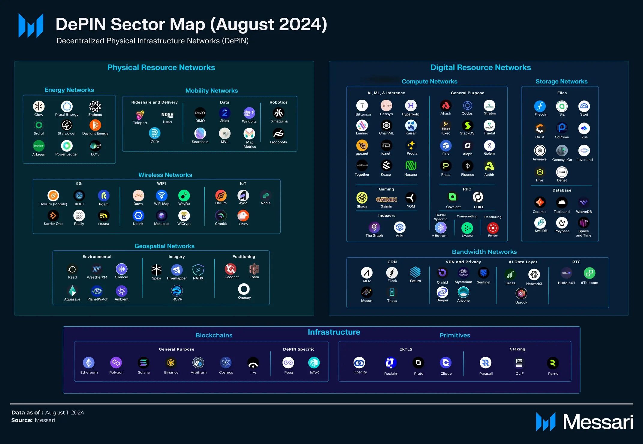 DePinissä on kaksi pääkategoriaa – fyysiset resurssiverkostot (PRN) ja digitaaliset resurssiverkostot (DRN).