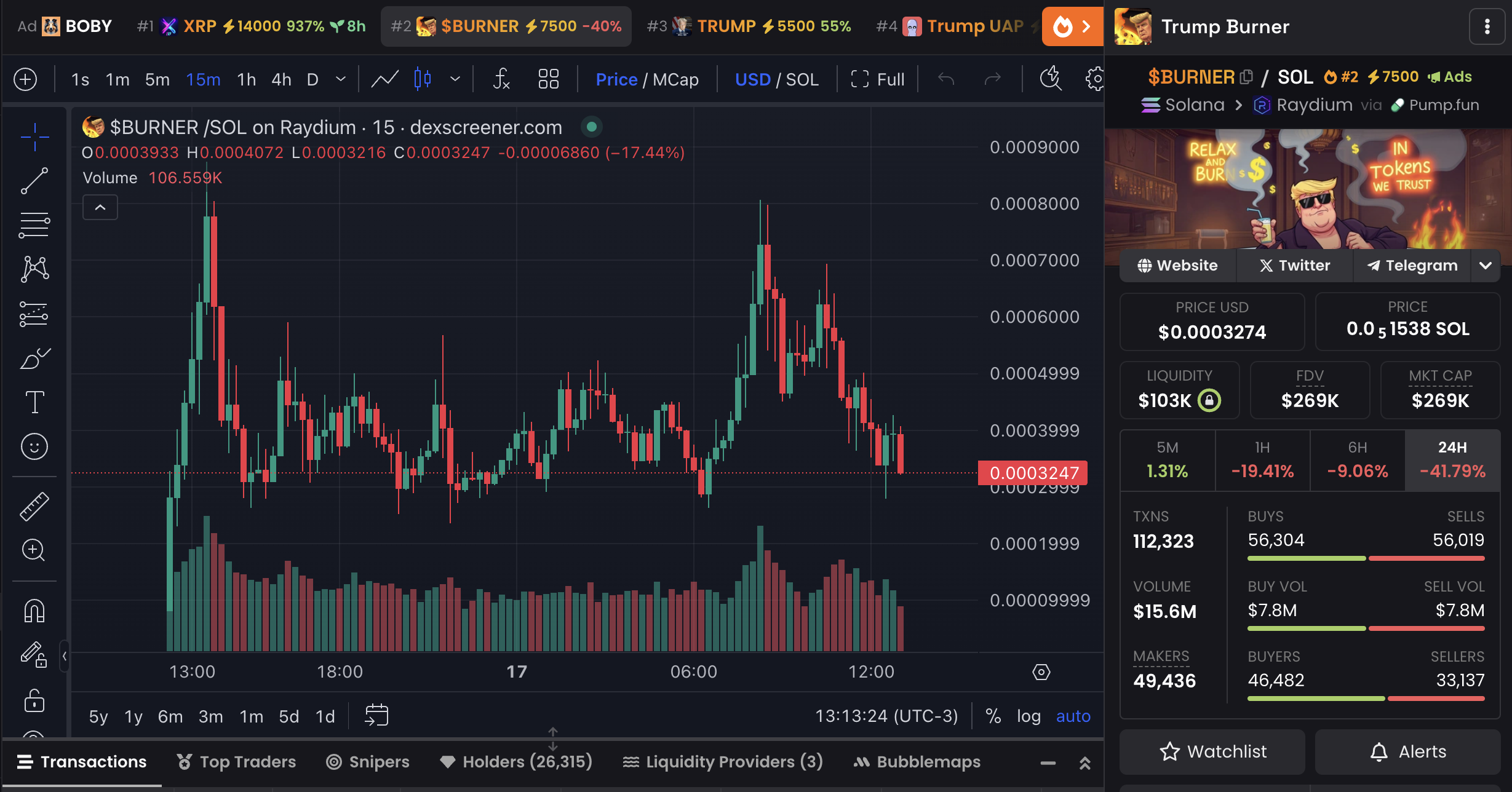 BURNER, meemikolikko, joka lanseerattiin vain päivä sitten Pump.funissa — Solanan suurimmalla launchpadilla — on nopeasti saanut jalansijaa. Yli 26 000 haltijaa, päivittäinen kaupankäyntivolyymi 15,6 miljoonaa dollaria ja yli 112 000 transaktiota tekevät siitä erottuvan yli 40 000 uudesta kryptosta, jotka julkaistaan päivittäin alustalla.