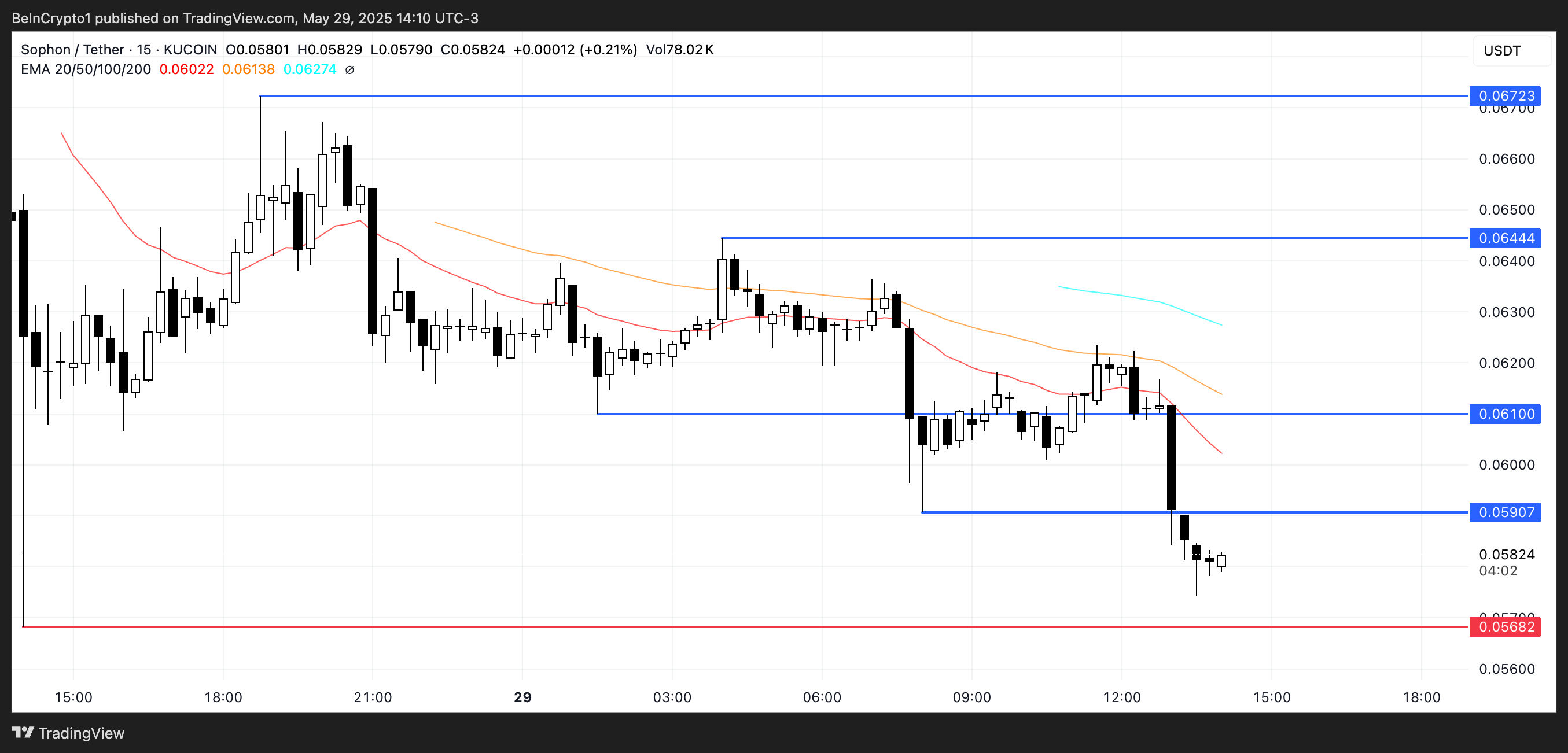 SOPH liikkuu nyt lähellä tärkeää tukitasoa 0,056 dollarissa, jota saatetaan testata pian, jos paine jatkuu. Jos token saa takaisin noususuuntausta, se voi haastaa vastustason 0,059 dollarissa.