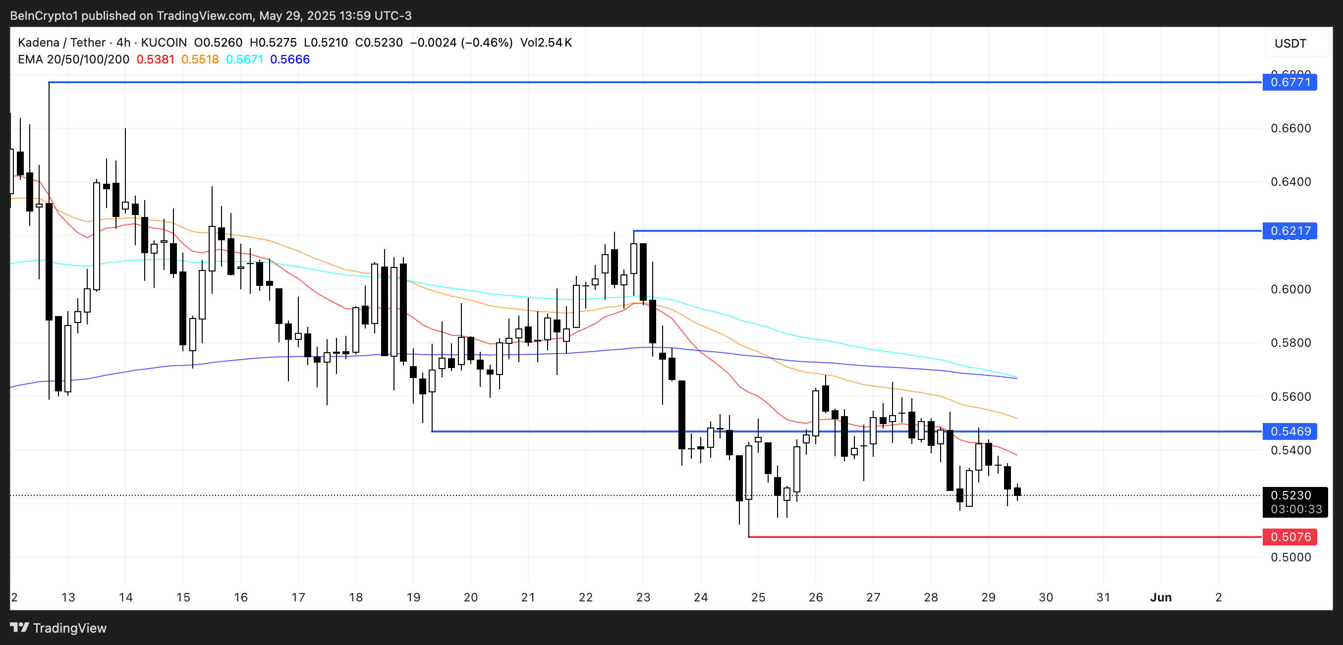 Jos nykyinen laskusuuntaus jatkuu, KDA voisi pudota kohti tukea 0,507 dollarissa.