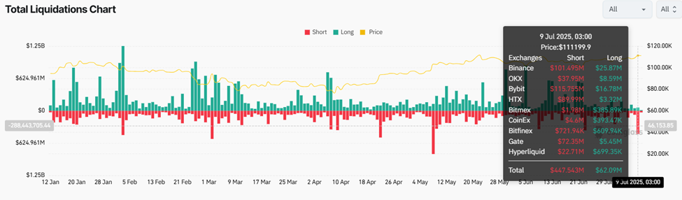 Coinglassin tietojen mukaan yli 114 500 kauppiasta likvidoitiin viimeisen 24 tunnin aikana, mikä johti 515,34 miljoonan dollarin tappioihin.