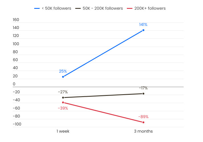 Yli 200 000 seuraajan vaikuttajat suoriutuvat huonoiten, keskimääräisen negatiivisen tuoton ollessa 89 % kolmen kuukauden jälkeen. Samaan aikaan pienemmät vaikuttajat, joilla on alle 50 000 seuraajaa, tarjoavat hieman parempia tuloksia, ja jotkut jopa saavuttavat positiivisia tuottoja ajan myötä.