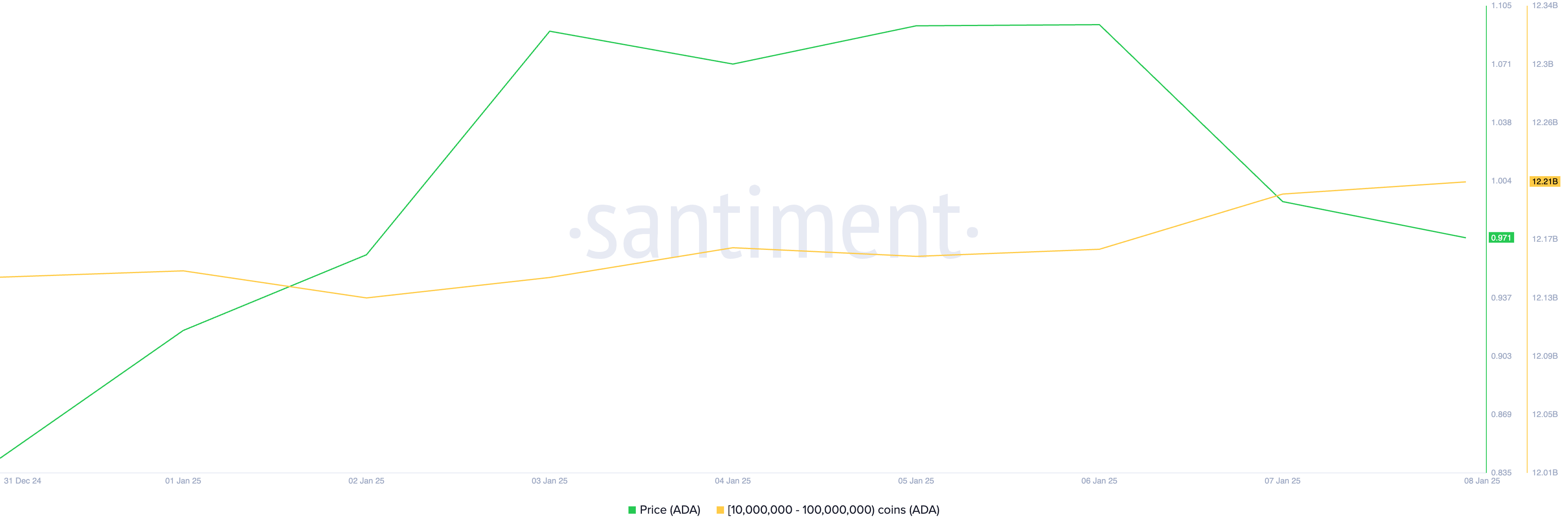 Santimentin tiedot osoittavat, että ADA-valaat, joilla on 10 000 000–100 000 000 kolikkoa, ostivat yhteensä 60 miljoonaa ADA:ta, arvoltaan yli 58 miljoonaa dollaria, viimeisen seitsemän päivän aikana. Tätä kirjoitettaessa tämä ADA-sijoittajaryhmä omistaa 12,21 miljardia kolikkoa, mikä on heidän korkein tasonsa viimeisen 30 päivän aikana.