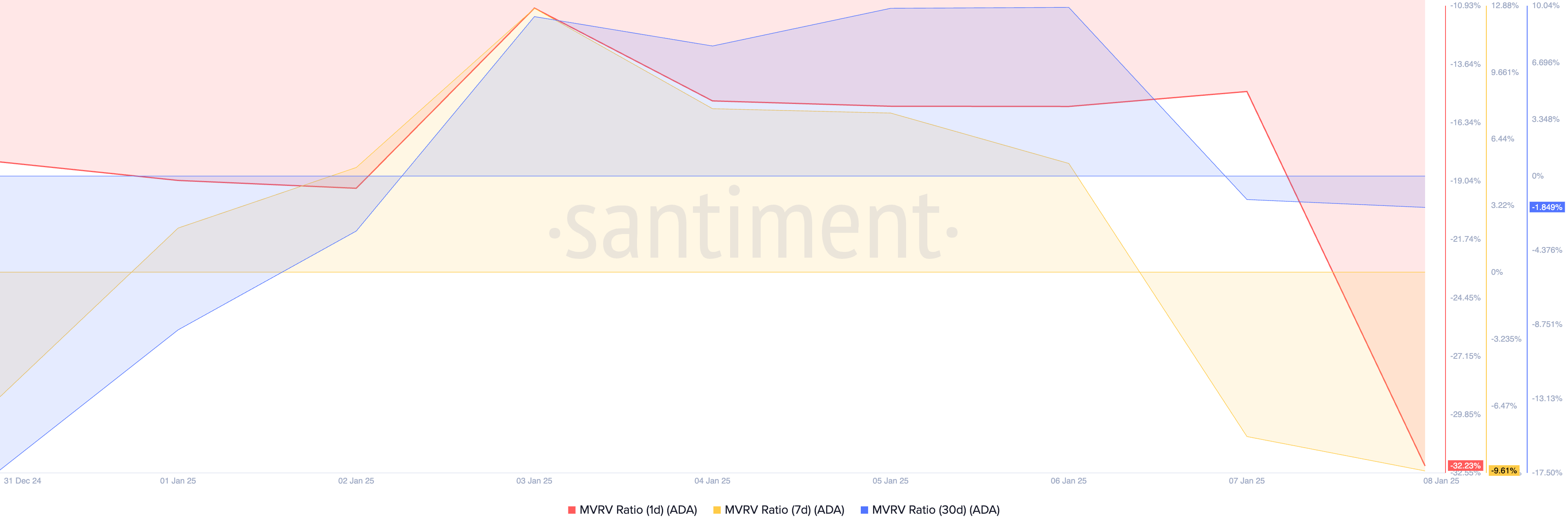 Negatiivinen MVRV-suhde, kuten Cardanon tapauksessa, viittaa aliarvostukseen, houkutellen ADA-valaita odottamaan hinnan palautumista.