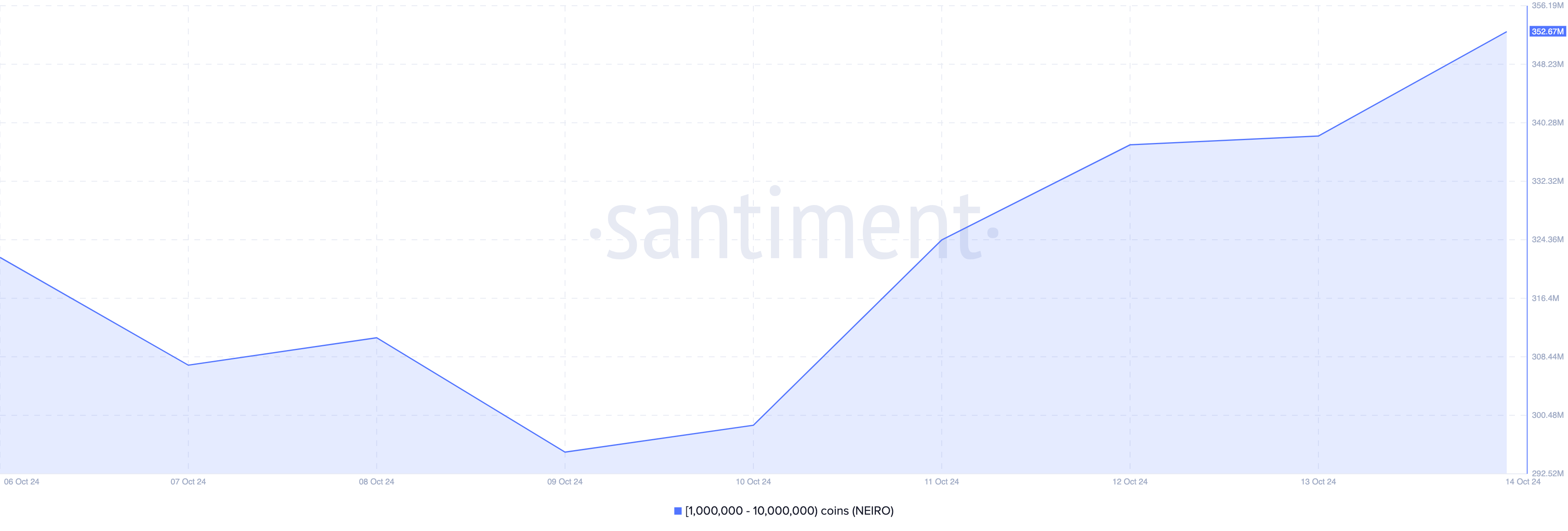 9. lokakuuta osoitteiden saldo, jotka pitivät hallussaan 1 miljoonasta 10 miljoonaan Neiro Ethereumia, oli 295,48 miljoonaa. Tätä kirjoitettaessa luku on noussut 352,67 miljoonaan, mikä tarkoittaa, että kryptovalaat ostivat noin 57 miljoonaa tokenia viimeisen viiden päivän aikana.