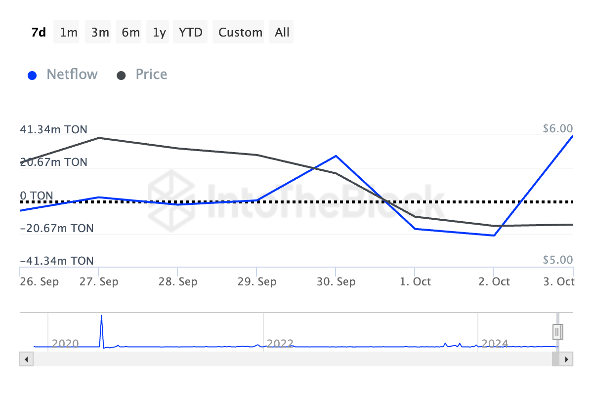 Kuitenkin tämä ei ole estänyt valashaita ostamasta altcoinia, osoittaen heidän pitkän aikavälin luottamustaan sen hintakehitykseen. Viimeisen seitsemän päivän aikana TON:n suurten omistajien nettovirta — ero kolikoiden määrässä, jonka valasosoitteet ostavat ja myyvät tietyn ajanjakson aikana — on noussut 1698%.