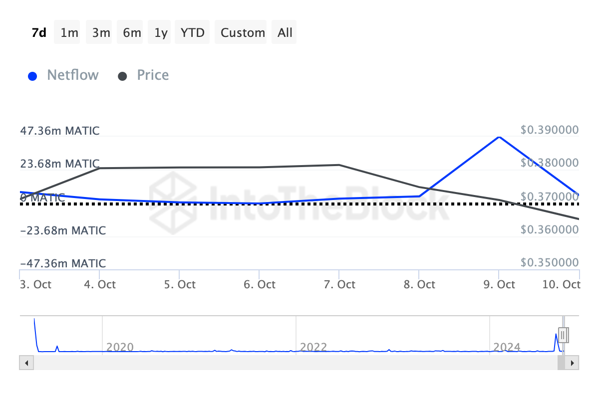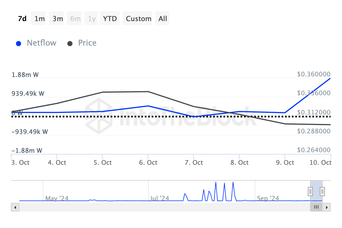 kuitenkin IntoTheBlockin mukaan suurten omistajien nettovirta nousi 4,71 miljoonasta 47,36 miljoonaan seuraavana päivänä, mikä osoittaa, että valaat lisäsivät kymmenkertaisesti aiemmat omistuksensa salkkuunsa.