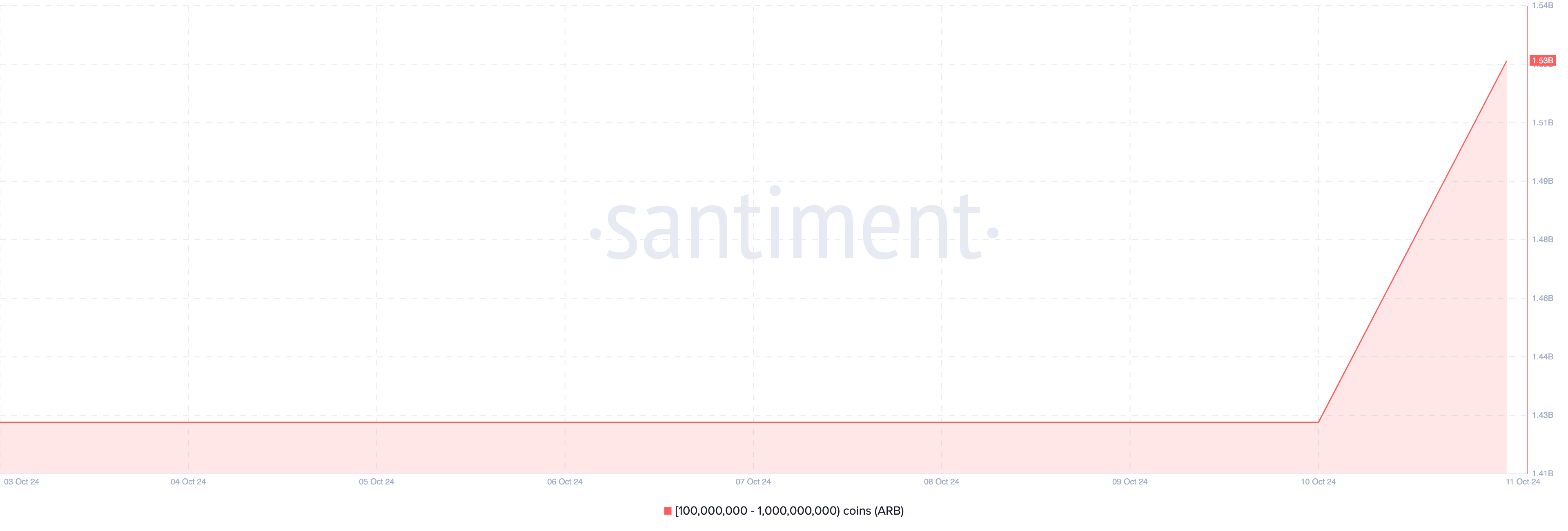 Arbitrum (ARB) on toinen altcoin, jonka kryptovalaat ostivat lokakuun 2024 toisella viikolla. Lokakuun 10. päivänä niiden osoitteiden määrä, jotka omistavat 100 miljoonaa ja 1 miljardin ARB:n välillä, oli 1,43 miljardia.