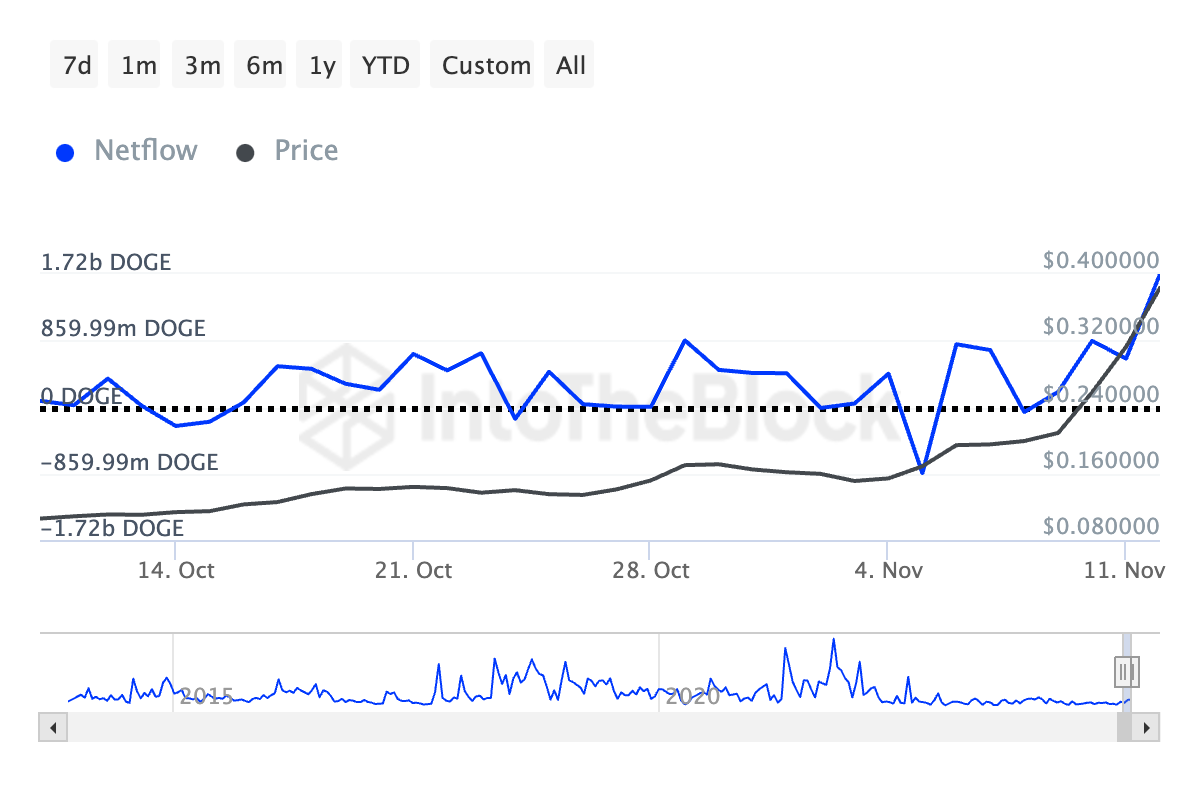 Johtava meemikolikko Dogecoin on yksi altcoineista, joita kryptovaluutta-valaat ostivat tällä viikolla. Suurten haltijoiden nettovirran nousu tarkastelujakson aikana vahvistaa tämän. IntoTheBlockin tietojen mukaan tämä on noussut 112 % viimeisen seitsemän päivän aikana.