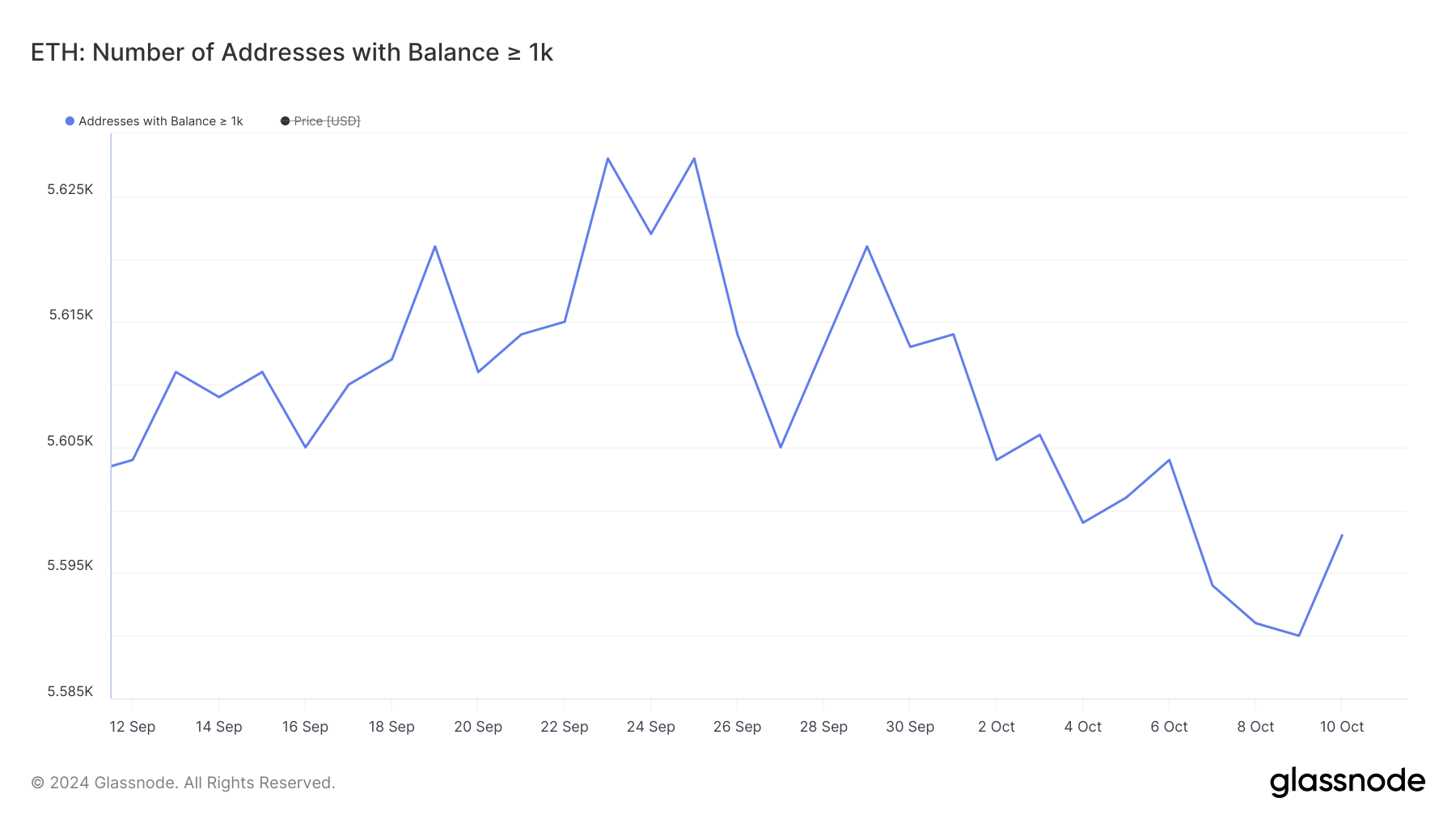 ETH-valaat olivat epäröiviä syyskuun puolivälissä. Sitten syyskuun lopusta lokakuun alkuun osoitteiden määrä, joissa oli vähintään 1 000 ETH, alkoi laskea merkittävästi.