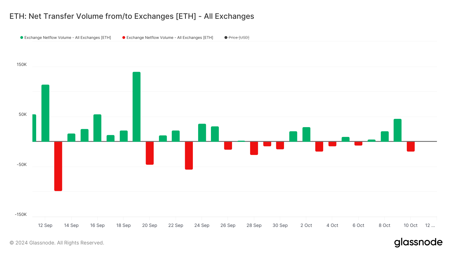 Merkitseviä poistumisia, kuten syyskuun puolivälissä ja lokakuun alussa, tapahtui, kun sijoittajat siirsivät suuria määriä ETH:ta pois pörsseistä. Nämä poistumiset pidetään yleensä härkämäisinä, koska ne viittaavat siihen, että omistajat suosivat pitkäaikaista kertymistä välittömän myynnin sijaan.