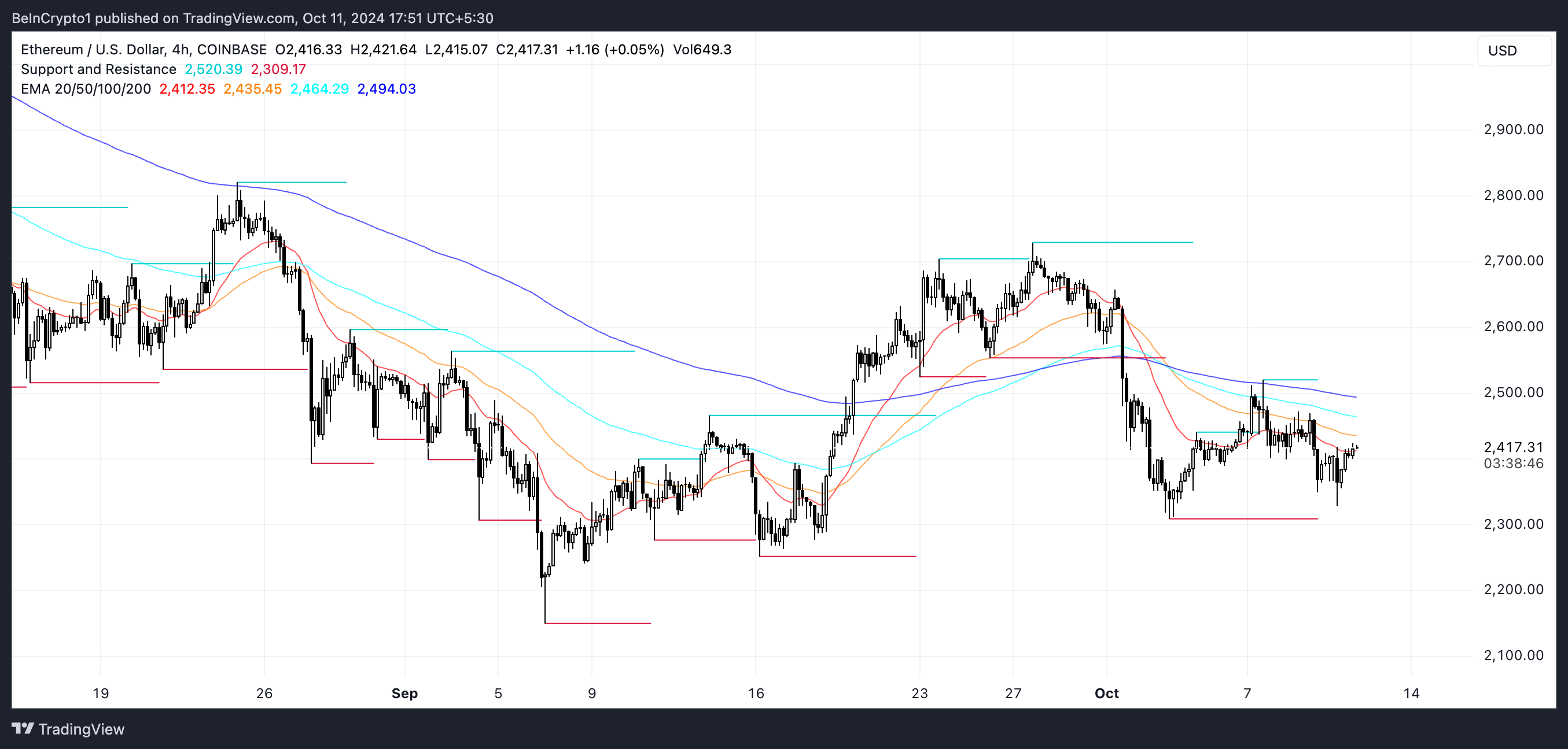 EMA-viivat tarjoavat arvokkaita näkemyksiä mahdollisista hintaliikkeistä. Jos laskutrendi jatkuu, ETH saattaa testata tukitasoja 2 308 tai jopa 2 250 dollarissa, mikä viittaisi lisäheikkouteen. Toisaalta, jos valashavainnot lisääntyvät ja luottamus palaa, nouseva trendi saattaa nähdä ETH:n hinnan testaavan vastustustasoja 2 467 ja 2 563 dollarissa.