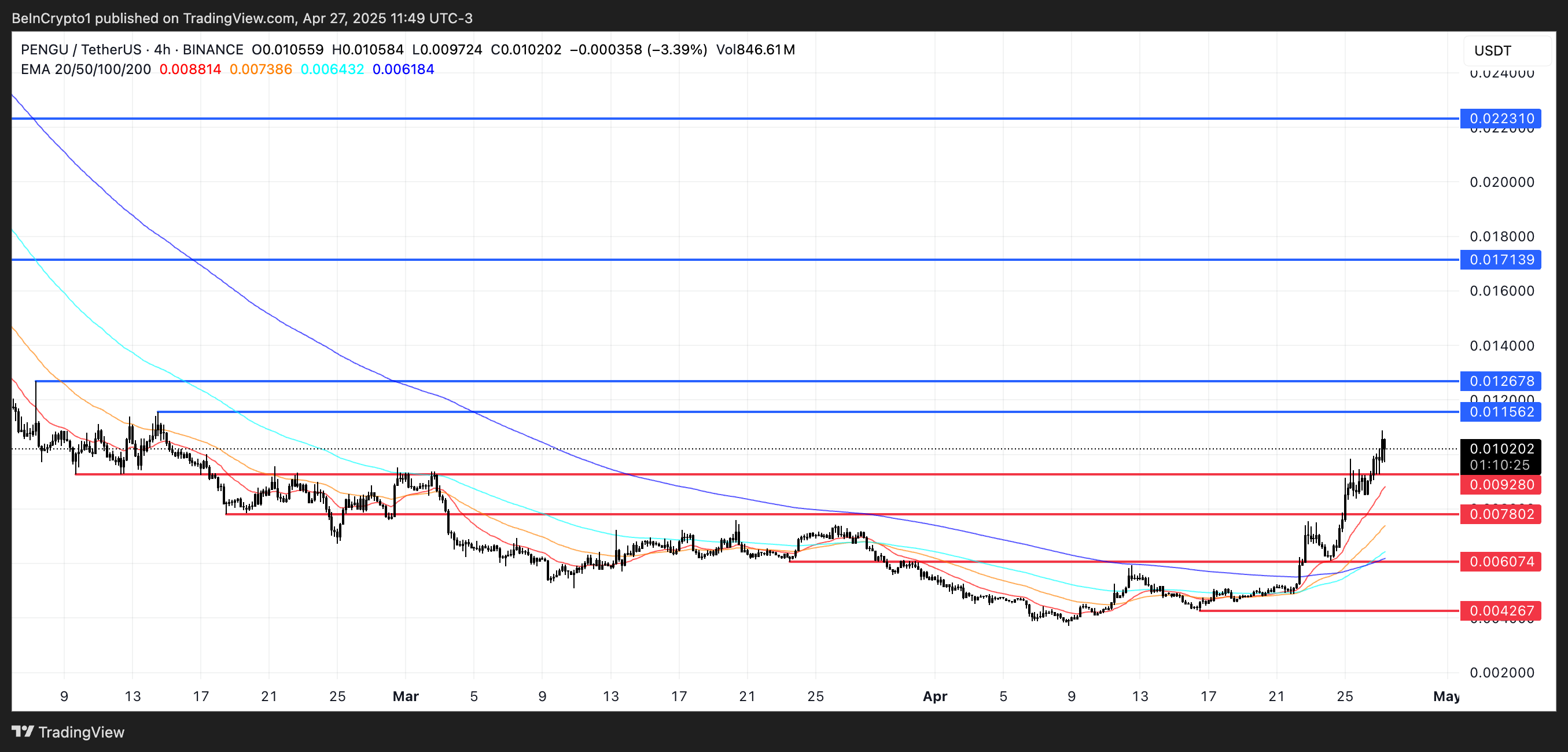 Viimeisen seitsemän päivän aikana PENGU on noussut 107 %, mukaan lukien yli 16 %:n nousu vain viimeisen 24 tunnin aikana. PENGU voi pian testata 0,011 dollarin vastustasoa, jos tämä vahva suuntaus jatkuu.