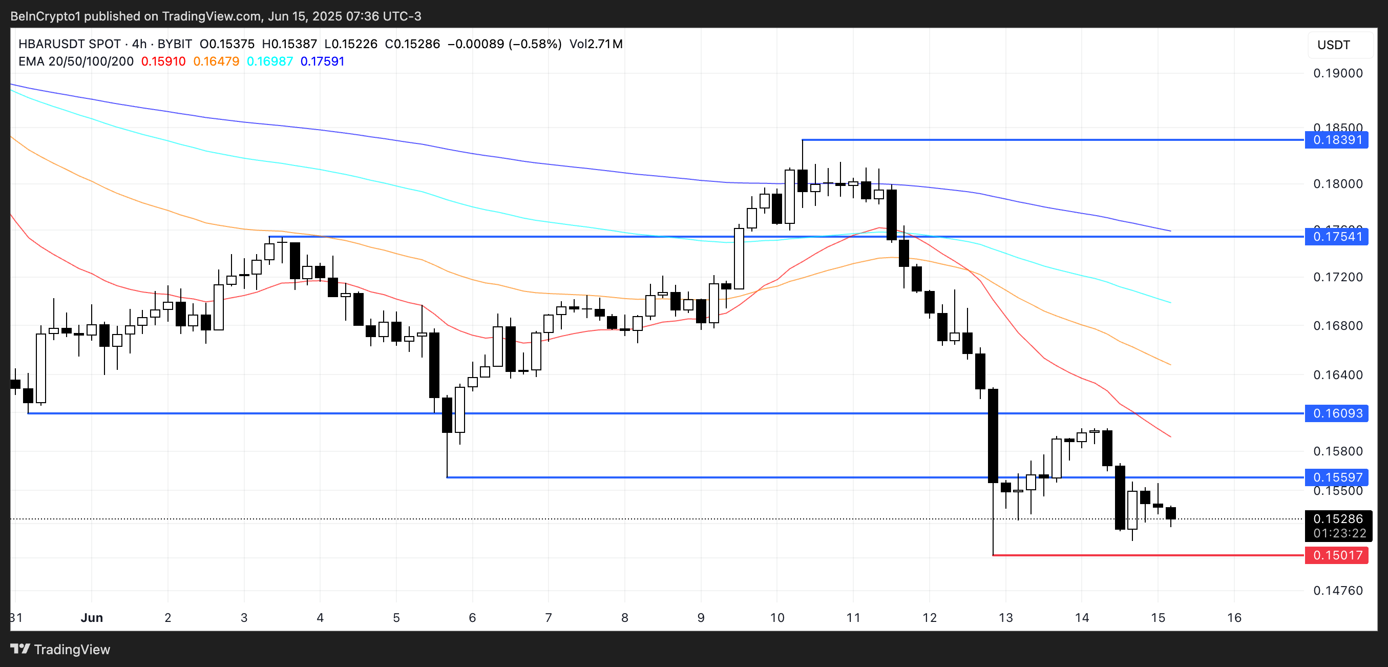 HBAR:n tekninen asettelu pysyy heikkona, sillä lyhyen aikavälin EMA-linjat ovat pitkän aikavälin alapuolella, mikä osoittaa vallitsevaa laskutrendiä.