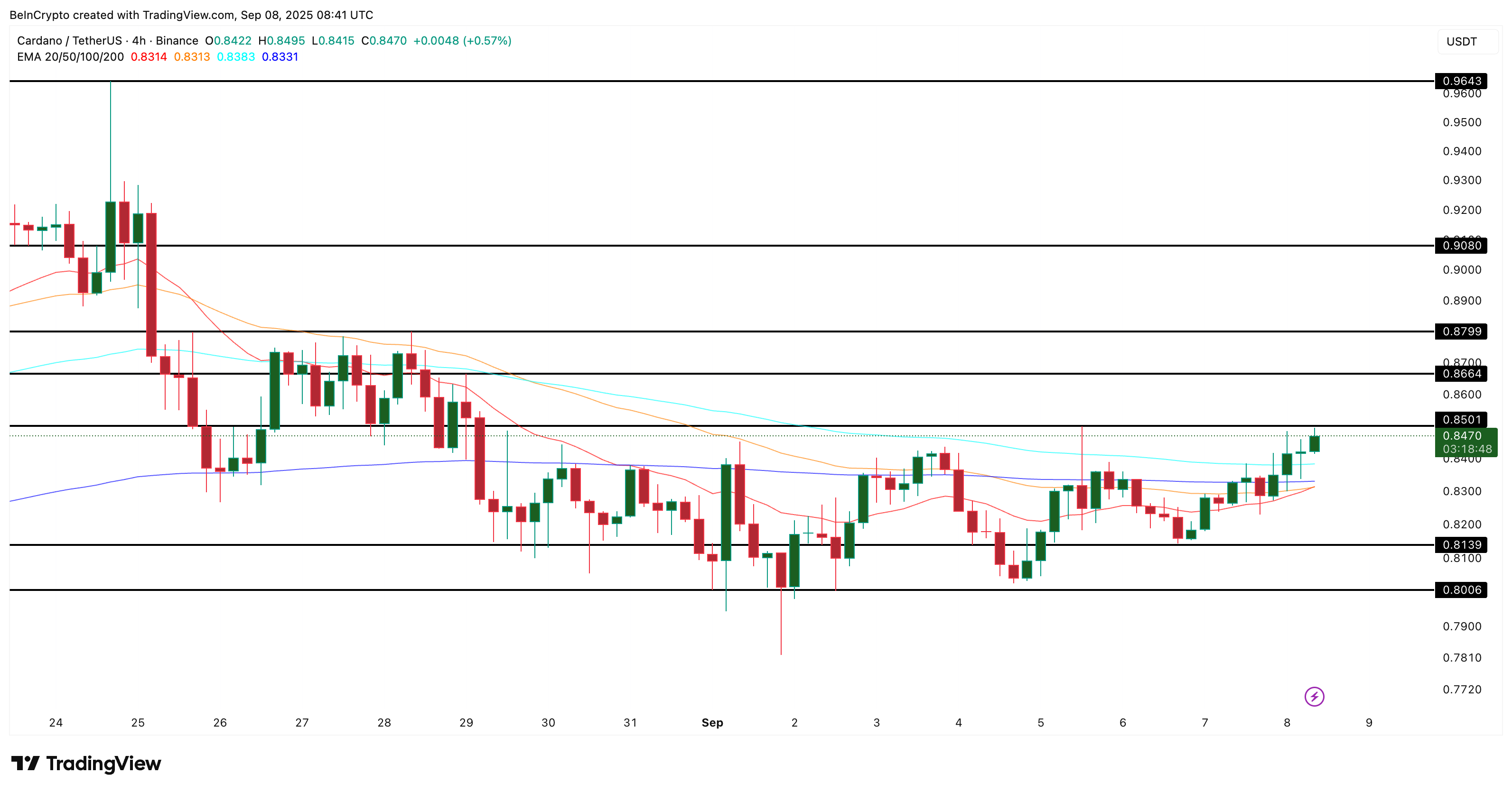 20-EMA-linja lähestyy nyt syvän sinistä eli 200-EMA-linjaa. Toinen nousujohteinen risteäminen voi auttaa Cardanon hintaa ylittämään keskeisiä esteitä.