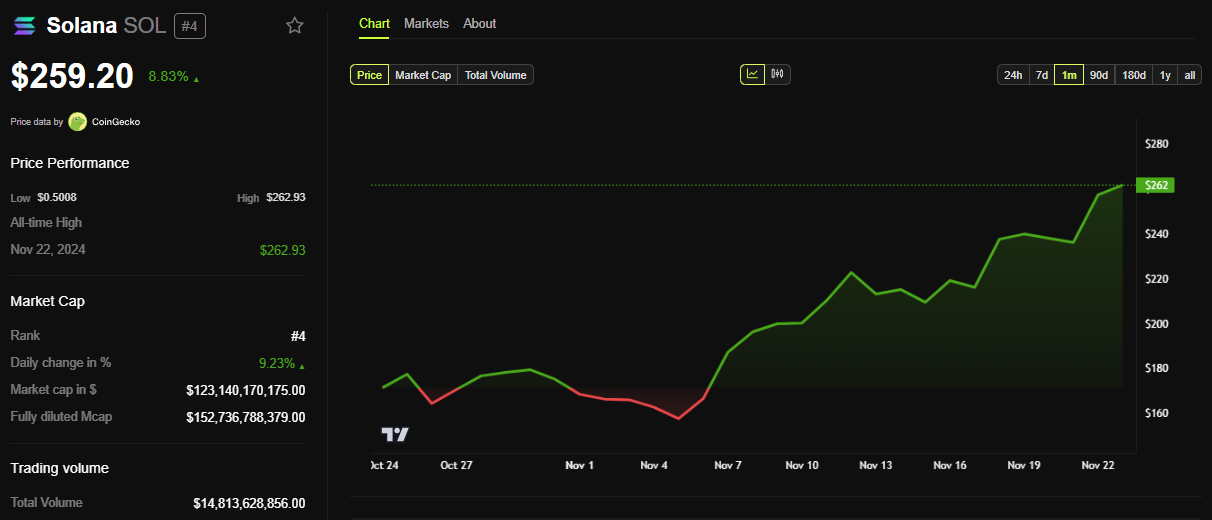 Onnistuessaan, nämä hakemukset voisivat vahvistaa Solanan asemaa kryptomarkkinoilla, mahdollisesti lisäten likviditeettiä ja vaikuttaen laajempiin markkinatrendeihin. BeInCrypto-tietojen mukaan Solanan tokenin arvo on noussut lähes 10 % ETF-optimismin myötä. Tätä kirjoitettaessa SOL:n hinta oli 259,20 dollaria.