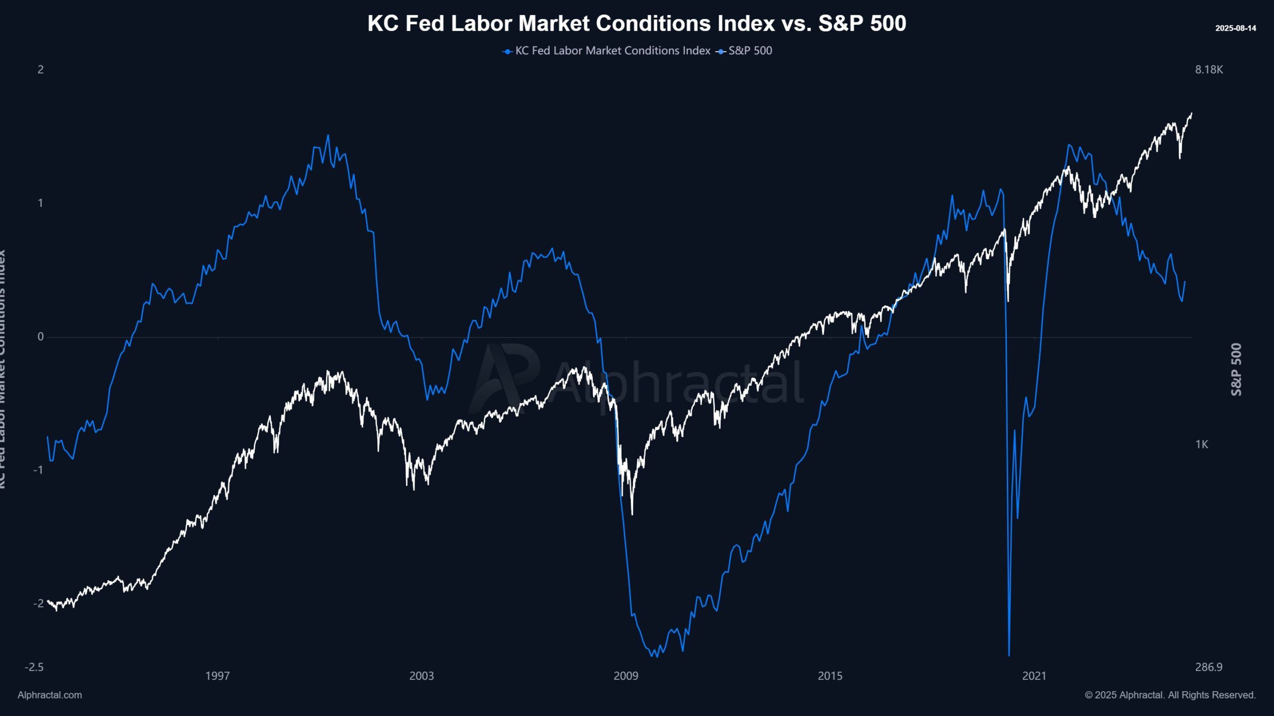 Kaavio osoittaa työmarkkinaolosuhteiden heikkenemisen samalla kun S&P 500 pysyy lähellä huippujaan, mikä korostaa kasvavaa eroa työllisyyden perustekijöiden ja osakemarkkinoiden suorituskyvyn välillä.