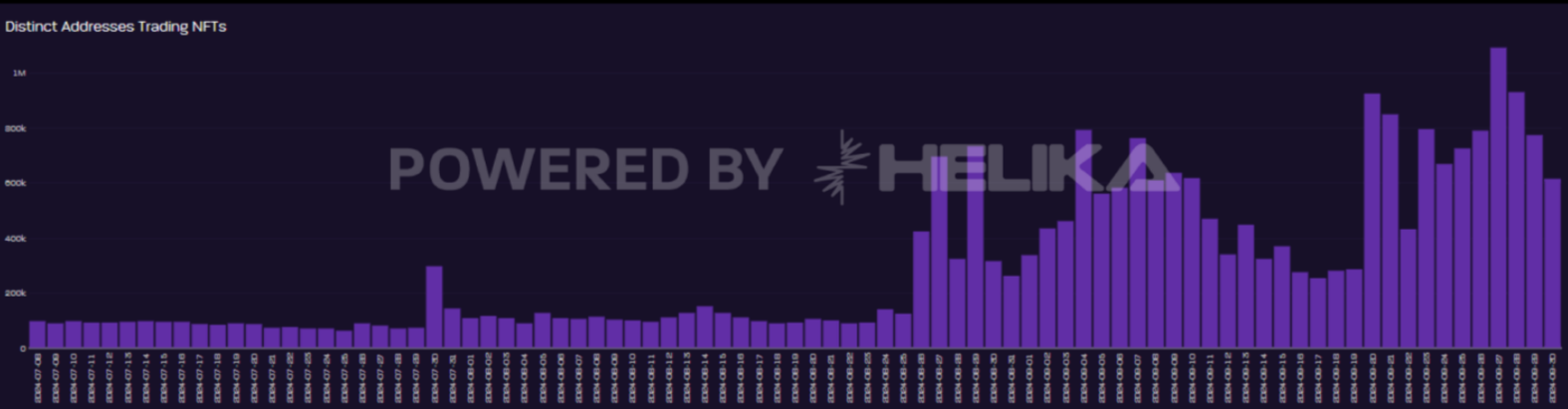 Helikan “Web3 Gaming Report Q3 2024” -raportin mukaan NFT:iden kaupankäynti TON-verkossa kasvoi edellisellä neljänneksellä. Heinäkuussa päivittäiset NFT-kaupankäyntiosoitteet olivat alle 200 000, mutta syyskuussa ne nousivat yli miljoonaan.