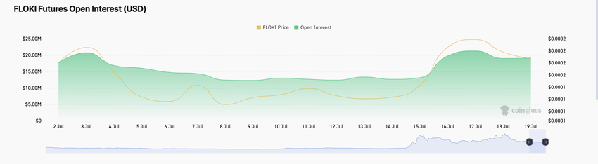 Flokin (FLOKI) arvon nousu viimeisen viikon aikana on johtanut aktiviteetin kasvuun sen johdannaismarkkinoilla. Tämä voidaan nähdä sen nousevasta futuurien avoimesta korosta, joka oli lehdistöhetkellä 19,20 miljoonaa dollaria ja on noussut 58 % viimeisen seitsemän päivän aikana.