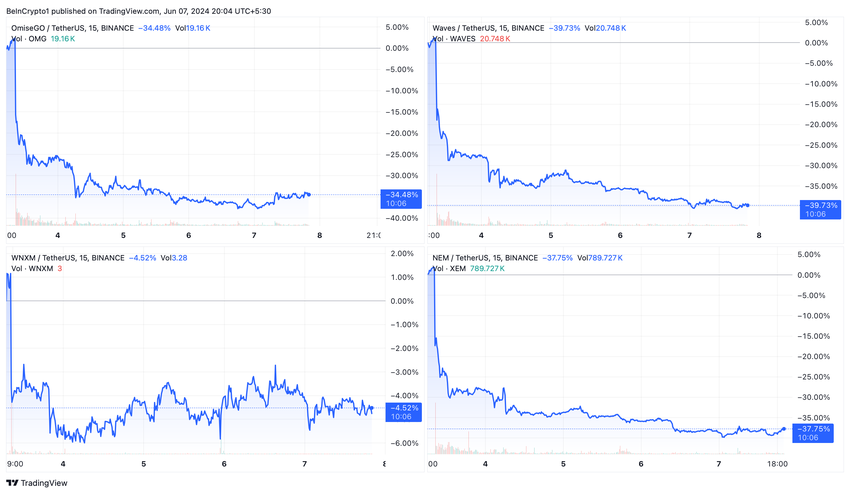 Tämän seurauksena näiden kolikoiden hinnat ovat laskeneet jyrkästi, ja OMG, WAVES ja XEM ovat kokeneet merkittäviä pudotuksia, kun taas WNXM on laskenut vain hieman.