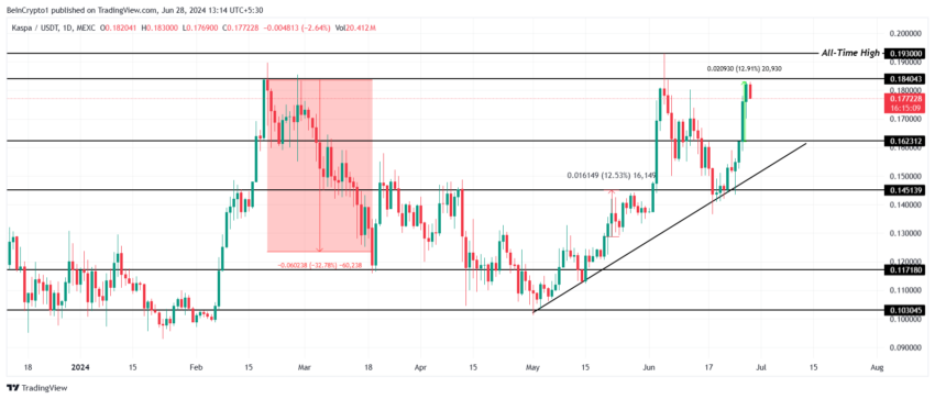 Kun otetaan huomioon sen jatkuva nousutrendi, Kaspan hinta voi mahdollisesti saavuttaa uuden kaikkien aikojen ennätyksen ensi kuussa. Toukokuun alussa alkanut nousutrendi jatkuu, ja KAS:n arvo on tällä hetkellä 0,177 dollaria, mikä asettaa sen hyödyntämään tätä vauhtia. Pelkästään viimeisen seitsemän päivän aikana altcoin on noussut 22 %.