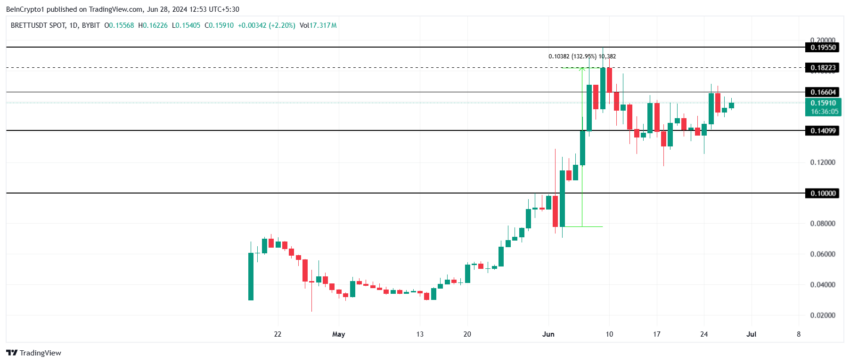 BRETTIN kaikkien aikojen huippu on 0,195 dollaria, ja on spekuloitu, että meemikolikko voisi ylittää tämän rajan. Kun otetaan huomioon tämän altcoinin jatkuva innostus ja kysyntä, se saattaa menestyä edelleen.