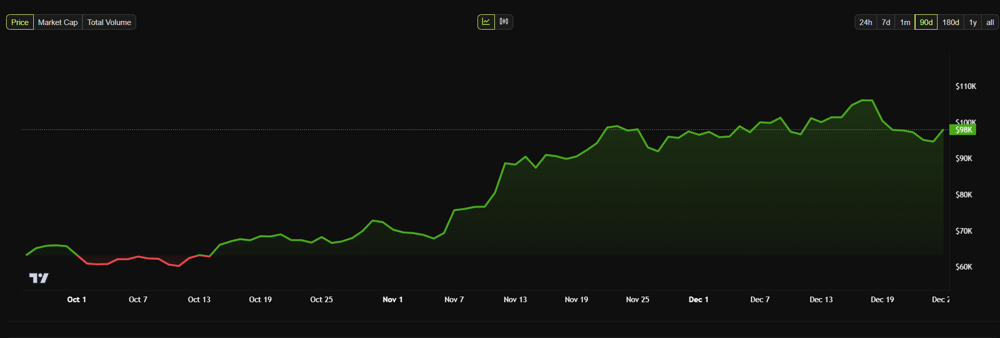 Trumpin voiton jälkeen kryptomarkkinat nousivat lähes 1 biljoonalla dollarilla, kun sijoittajat aistivat sääntelyvalvonnan helpottumisen. Peräkkäin Bitcoin nousi uusiin huippuihin, saavuttaen lopulta 100 000 dollarin rajapyykin.