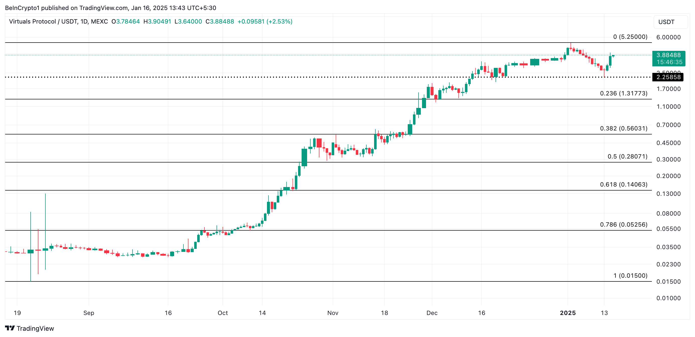 VIRTUALin Fibonacci Retracement -työkalun lukemat osoittavat, että se käy tällä hetkellä kauppaa alle kaikkien aikojen korkeimman hintansa 5,25 dollaria, mikä edustaa merkittävää vastustustasoa.