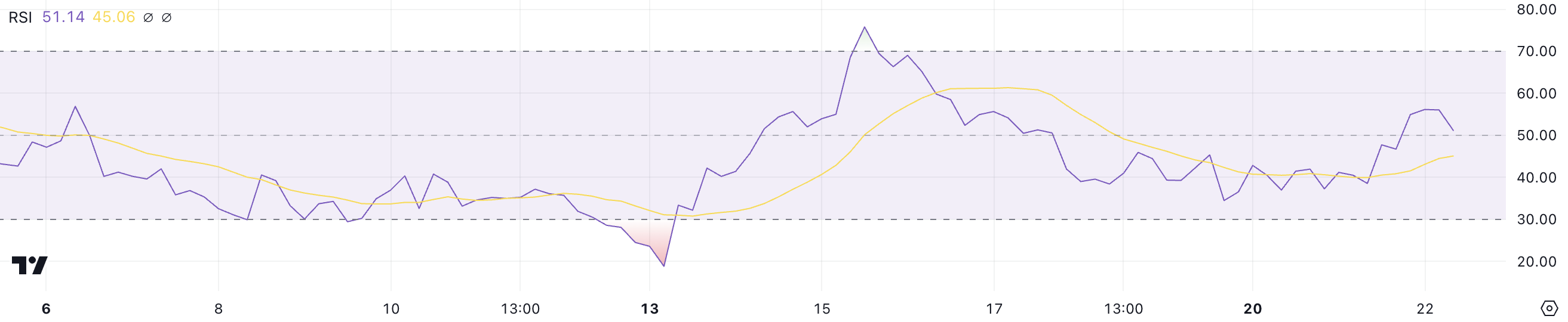 VIRTUAL Relative Strength Index (RSI) on tällä hetkellä 51,1, hieman laskenut aiemmasta huipustaan 56, mutta osoittaa palautumista edellisten neljän päivän aikana, jolloin se vaihteli 35:n ja alle 50:n välillä.