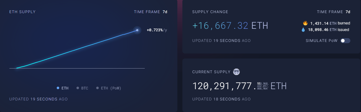 “Ketjuaktiviteetin vähenemisen vuoksi eth-kaasu on ollut alle 2 gwei pitkään, aina tämän vuoden huhtikuun alusta lähtien. Viimeisen neljän ja puolen kuukauden aikana eth:n kokonaismäärä on kasvanut 120,063,605:stä 120,291,622:een, ja inflaatio on kasvanut 228,000:lla. Tämän perusteella vuosittainen inflaatio olisi 600k, inflaatioasteen ollessa 0,5%,” blockchain-tutkija embercn kirjoitti.