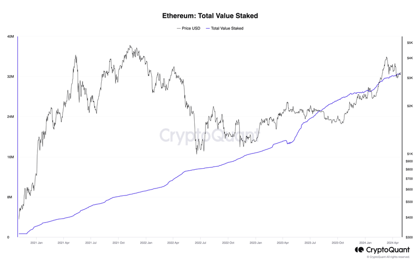 PoS-ketjuun siirtymisen jälkeen Ethereum on nähnyt validoijien määrän ja panostuskysynnän nousun. Yli 25% ETH: n kiertävästä tarjonnasta on panostettu, mikä parantaa verkon turvallisuutta ja tarjoaa tuottoa osallistujille.