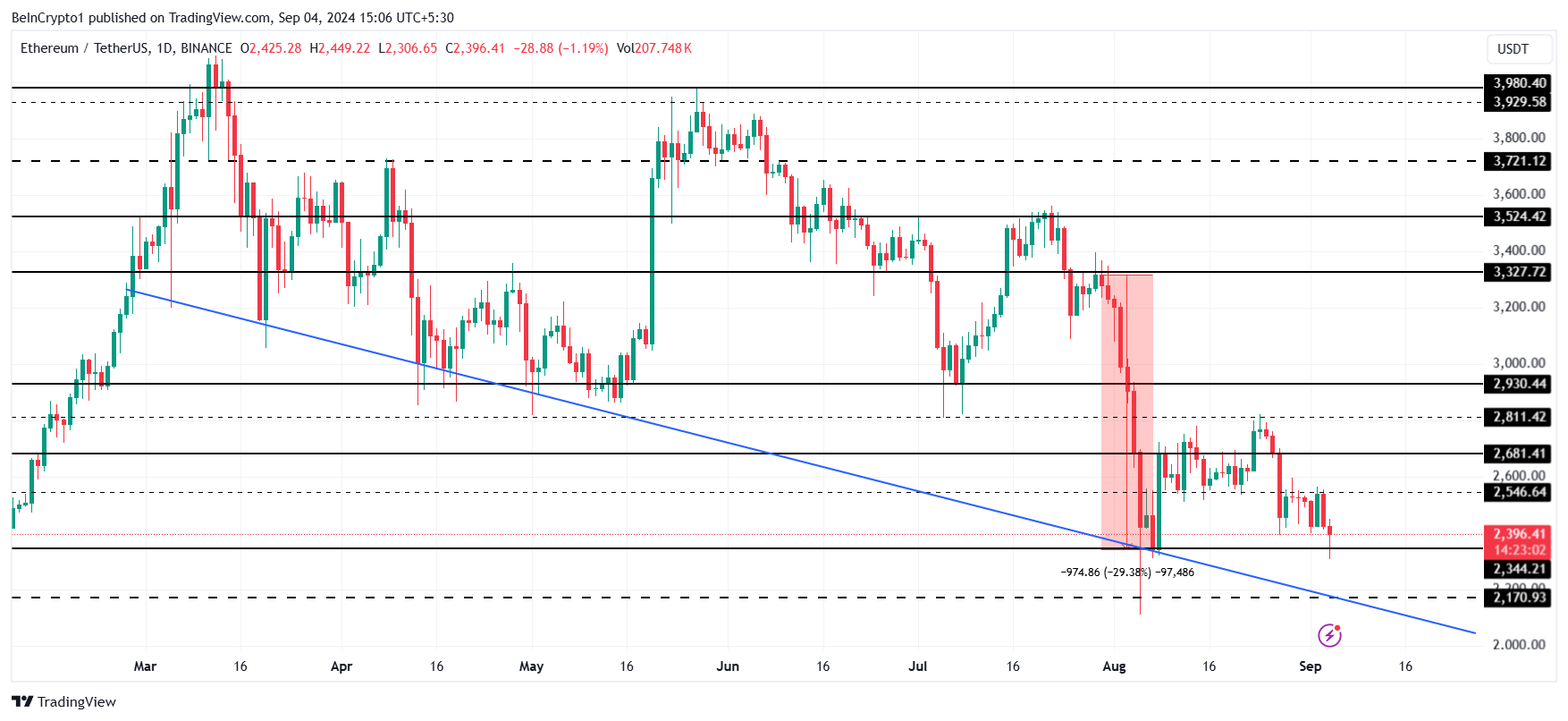 Ethereumin hinta on pysynyt kriittisen 2 811 dollarin vastustason alapuolella 30 prosentin pudotuksen jälkeen heinäkuun lopussa, viimeaikaisen konsolidoinnin tapahtuessa 2 546 dollarin alla. Tämä konsolidointi viittaa siihen, että ETH kamppailee saavuttaakseen ylöspäin suuntautuvaa momenttia, mikä on olennaista mahdollisen toipumisen kannalta.