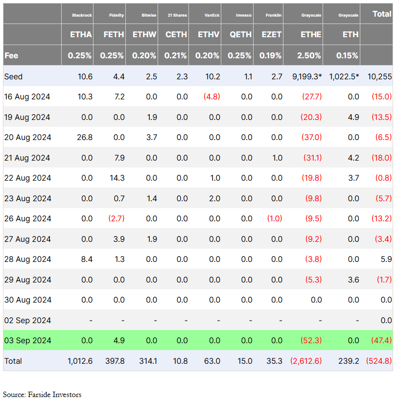 Institutionaaliset sijoittajat ovat osoittaneet selvää innottomuutta Ethereumia kohtaan spot ETH ETF:ien lanseerauksesta lähtien. Ensimmäisen kuukauden aikana nämä ETF:t kirjasivat noin 476 miljoonan dollarin ulosvirtaukset. Ulosvirtauksiin vaikutti merkittävästi Grayscale Ethereum Trustin (ETHE) vapautuminen, mikä aiheutti karhumaisen vaikutuksen koko markkinoilla.