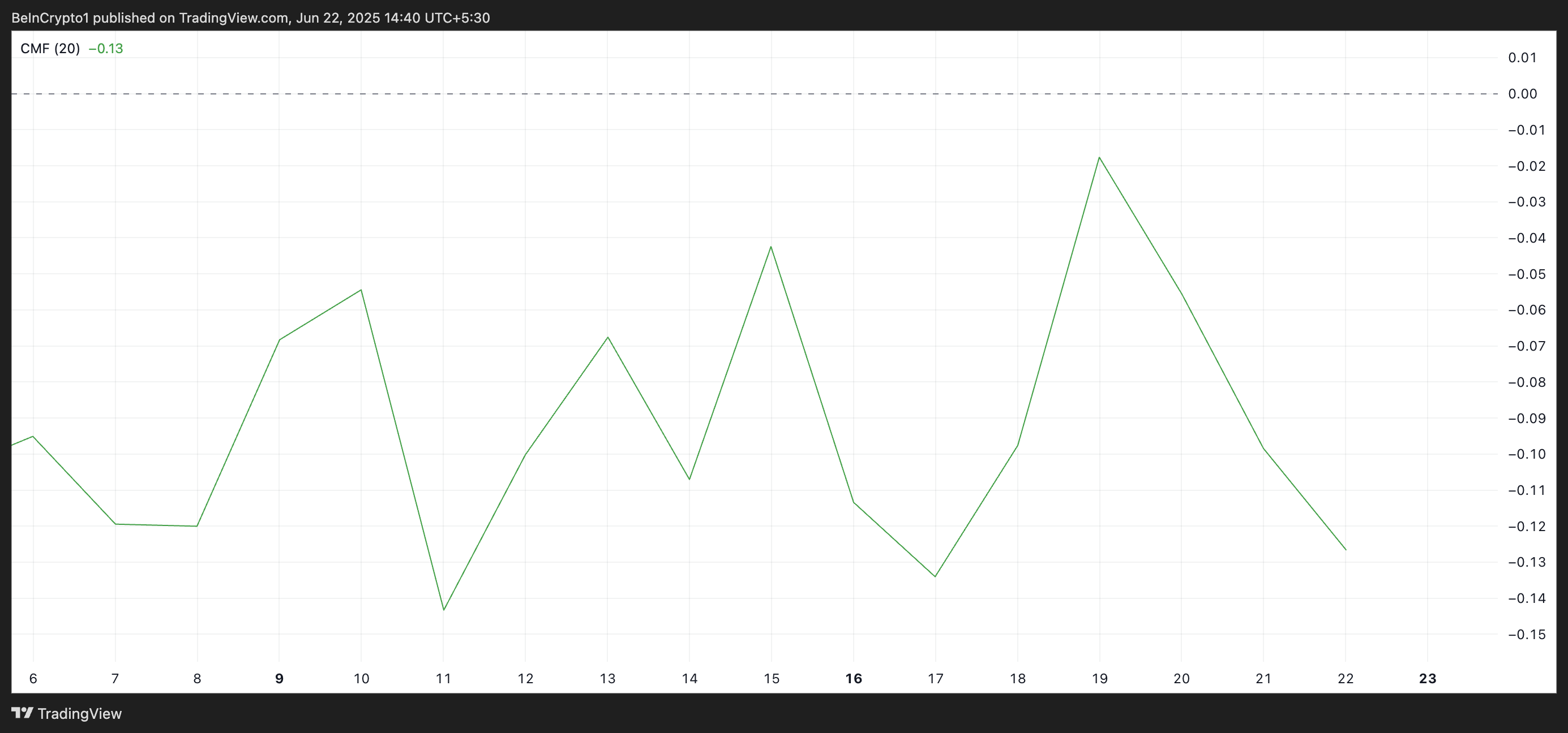 CMF mittaa rahan virtausta omaisuusvaraan tietyn ajanjakson aikana, yleensä 20 tai 21 päivää. Se yhdistää hinta- ja volyymitiedot arvioidakseen osto- ja myyntipainetta. Kun omaisuusvaran CMF on positiivinen, ostovolyymin hallitessa pääoma virtaa omaisuusvaraan, mikä viittaa mahdolliseen härkämäiseen tunnelmaan.