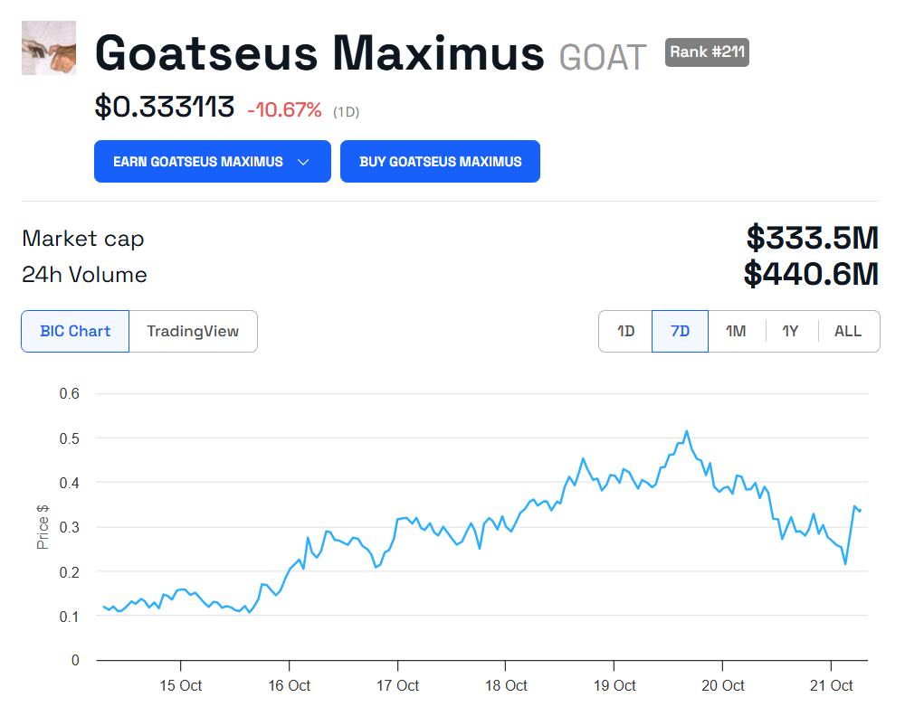 GOAT-token on meemikolikko Solanassa. Vaikka “Totuuden terminaali” ei suoraan luonut tai lanseerannut GOAT-tokenia, sen meemikolikon edistäminen houkutteli merkittävää huomiota. BitMEX:n perustaja Arthur Hayes jopa ennusti, että GOAT-tokenin markkina-arvo voisi saavuttaa miljardi dollaria.