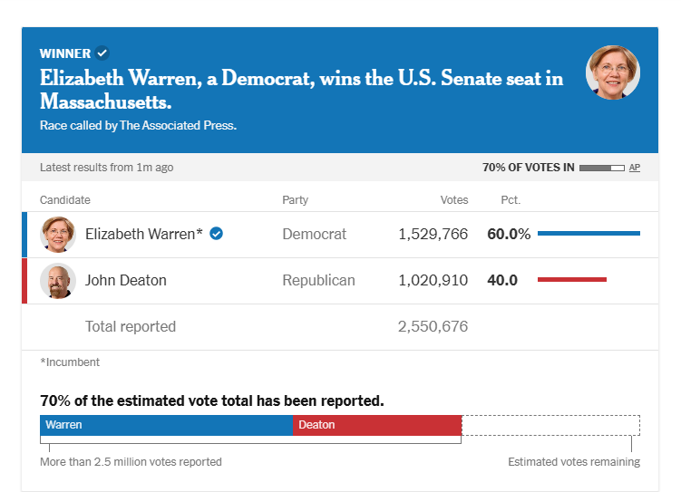 Associated Press ilmoitti voitosta tiistai-iltana noin kello 20, kun Warren sai 73% äänistä Deatonin 26% vastaan.